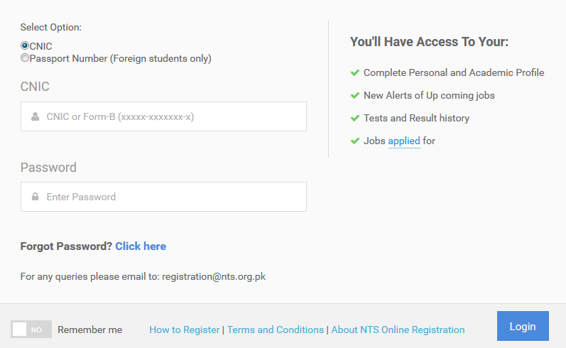 Enter your detail that you used while creating your account. After that you will need to fill your complete online form with details of your academic records, etc. You may fill that form and download the bank challan form. Submit the prescribed fee the any of the bank mentioned in the challan form. Create a copy of this challan form and keep it with you till you receive SMS prescribing your roll number and Test center. You’ll need to dispatch the challan form to NTS Islamabad office address: 1-E, Street No. 46, I-8/2, Islamabad.